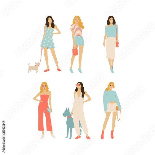 Girls Standing On A Street Street Fashion Vector Illustration Set Of Young Women And Dogs Buy This Stock Vector And Explore Similar Vectors At Adobe Stock Adobe Stock